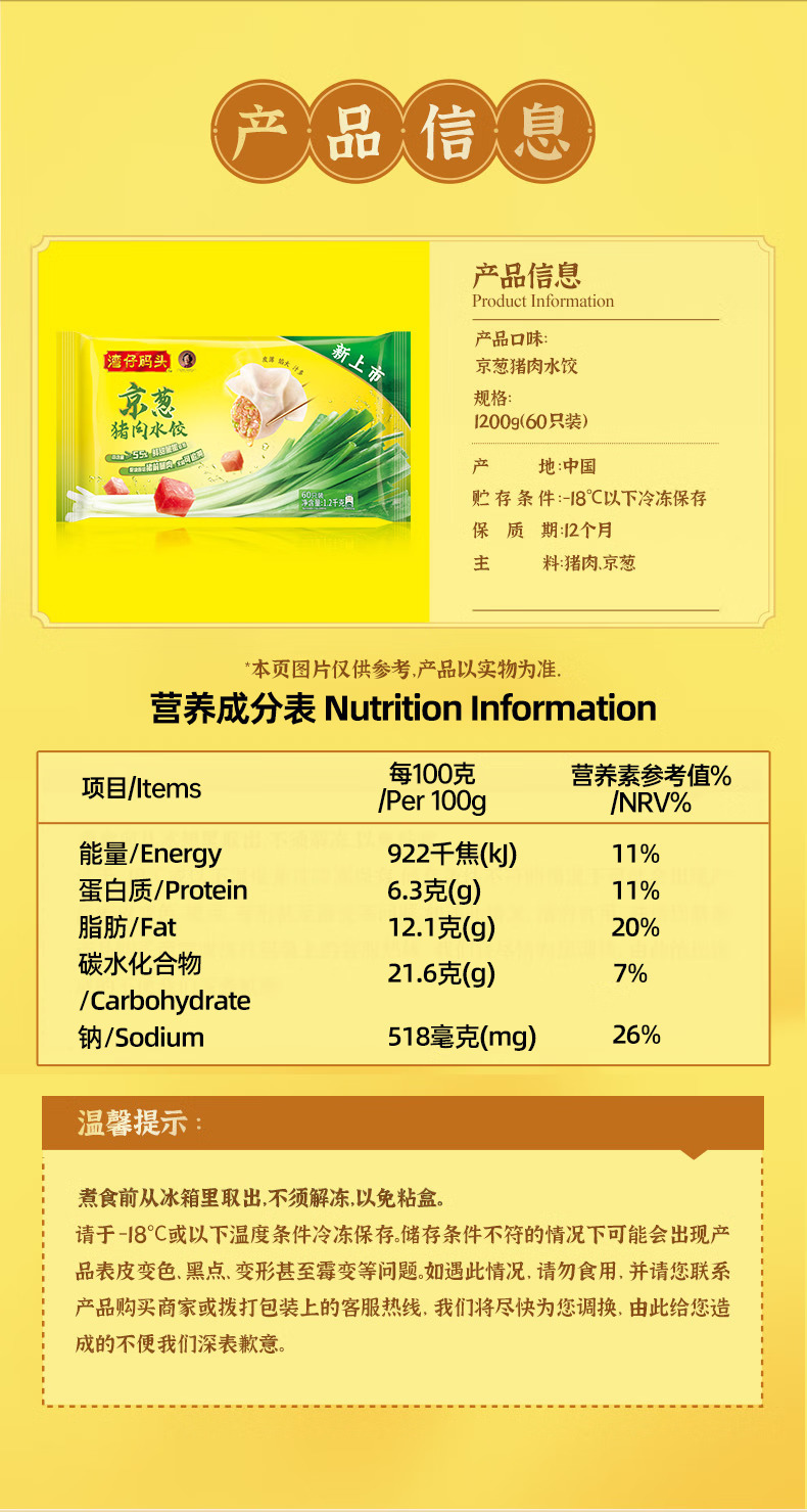 湾仔码头京葱猪肉大葱饺子1200g60只水饺早餐食品速食半成品面点